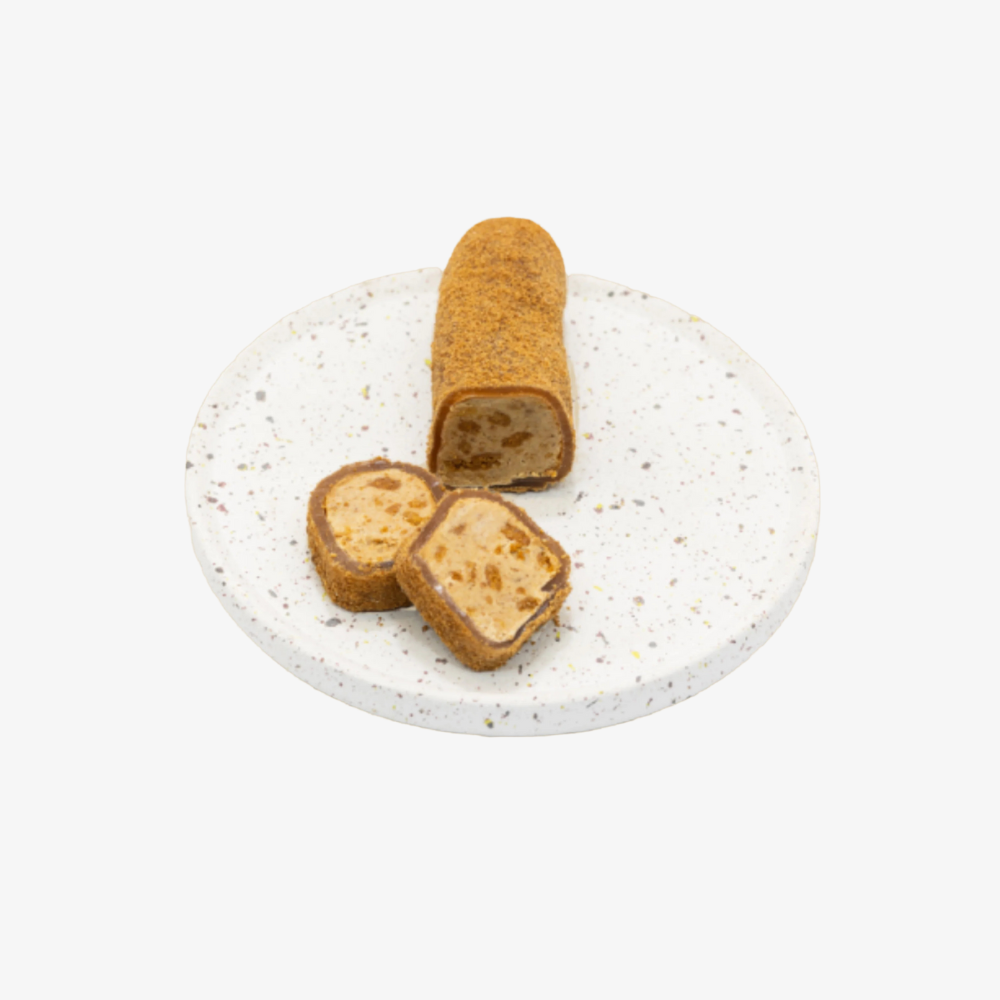 Basis van Lotus-crème, gevuld met stukjes Lotuskoek en gerold in gemalen Lotuskoek.
