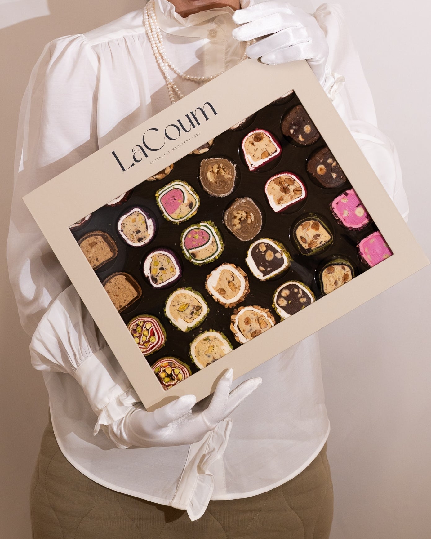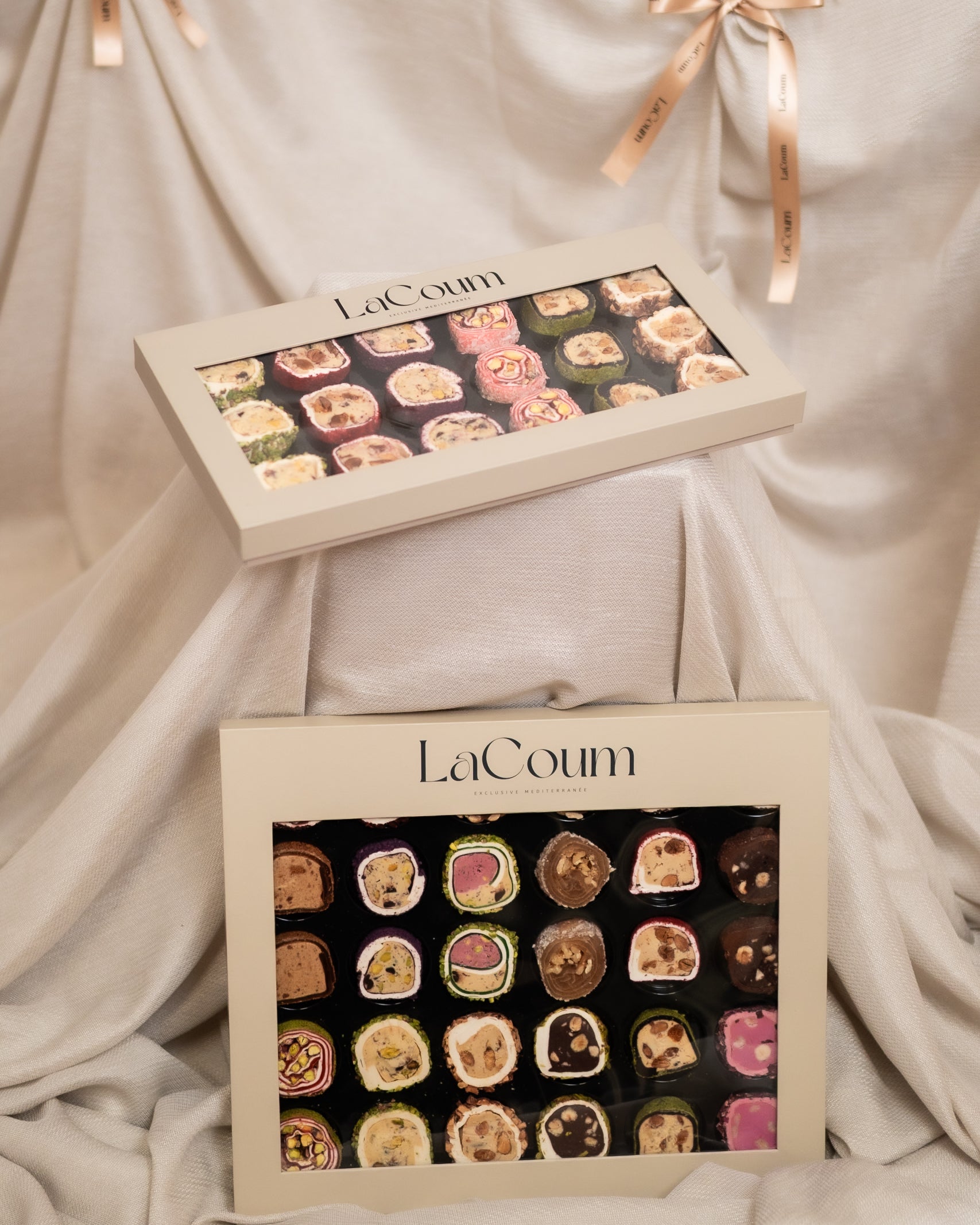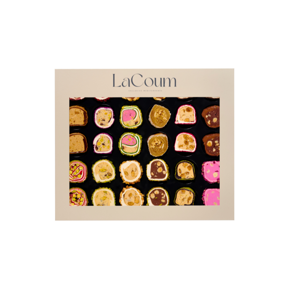 suiker, maïszetmeel, water, pistache (12%) en/of amandel (12%) en/of hazelnoot (14%), kokosnoot, vullingen [hazelnootcrème: suiker, plantaardige olie (zonnebloem, palm), hazelnoot (10%), weipoeder (melk), magere melkpoeder, emulgator (sojalecithine), natuurlijke aroma’s (vanille); en/of amandelcrème: suiker, plantaardige olie (zonnebloem, palm), amandel, weipoeder (melk), magere melkpoeder, emulgator (sojalecithine), natuurlijke aroma’s (vanille); en/of cacao-hazelnootcrème: suiker, plantaardige olie (zonnebloem), weipoeder (melk), magere cacaopoeder, hazelnoot (10%), emulgator (zonnebloemlecithine), natuurlijke aroma’s (vanille); en/of paarse cake: suiker, tarwebloem (gluten), melkpoeder, tarwezetmeel, emulgatoren, rijsmiddel, blauwe spirulina, natuurlijke kleurstof (rode biet), zout, natuurlijke aroma’s; en/of lotuskoek: tarwebloem (gluten), suiker, plantaardige olie (zonnebloem), glucosestroop, rijsmiddel, zout, specerijen, natuurlijke aroma’s], rozenbladeren, zwarte moerbeivulling, zeepkruid plantenextract, verdikkingsmiddel, zuurteregelaar (citroenzuur [E330]), kleurstof (E124) en/of natuurlijke kleurstof (rode biet).